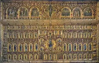 The altarpiece consists of two parts. The enamels in the top section of the Pala d'Oro contain the Archangel Michael at the center, with six images depicting the Life of Christ on either side of him, which were added in 1209. They show the Entry of Christ into Jerusalem, Descent into Limbo, Crucifixion, Ascension, Pentecost, and Death of the Virgin.[2] It's generally thought that these were not originally part of the altarpiece, as their stylistic features place them into the 12th century, and they were probably looted during the Fourth Crusade.[8]