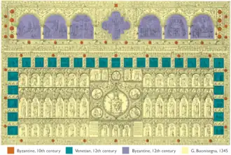 The Pala d'Oro was thought to be first commissioned in 976 by Doge Pietro Orseolo, where it was made up of precious stones and several enamels depicting various saints, and in 1105 it was expanded on by Doge Ordelafo Faliero.[1] In 1345, the goldsmith Giovanni Paolo Bonesegna was commissioned to complete the altarpiece by Andrea Dandolo, who was the procurator at the time, and later became doge. Bonesegna added a Gothic-style frame to the piece, along with more precious stones.[2] Dandolo also included an inscription describing what his own additions were, along with those of his predecessors.[3]