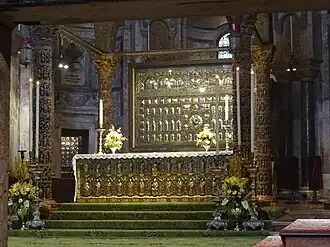Pala d'Oro (Italian: Golden Panel) is the high altar retable of the Basilica di San Marco in Venice (and in Italian may refer to other gold altar frontals elsewhere). It is universally recognized as one of the most refined and accomplished works of Byzantine enamel, with both front and rear sides decorated. It was created and expanded in several phases over many centuries. Most of the enamel panels were made in Constantinople or Italy in a Byzantine style, but some were probably looted in Constantinople during the Fourth Crusade in 1204 and brought from there to Venice.