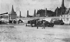 A state of emergency was declared by the government in anticipation of the countercoup.[2] It began on February 26, when a Royal Thai Army officer loyal to Pridi and a group of supporters seized a radio station, and Free Thai elements and Thammasat University teachers and students occupied the Grand Palace. The group at the radio station announced on the air the formation of a new government headed by Pridi's friend, Direk Jayanama.