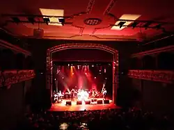 In the interior, the theatre has 630 which include disabled seating.[4] The theatre has free superfast Wi-Fi capable of video conferencing and en-suite toilets.[5] The auditorium has a curiously archaic appearance, like an early music hall, with balconies on three sides. The ceiling is flat, made up of eight panels each bordered with delicate plaster mouldings. The proscenium has a flattened arch with a width of 8.5m and a height of 6.7m. The orchestra pit has been rebuilt and is capable of being covered over to provide an apron. Originally the stalls floor was only slightly raked.[6]