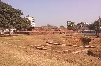 Excavations of the mound of Raja Harishchandra from 1990 to 1991 uncovered a medium-sized obelisk and the ruins of a Buddhist monastery to the south.[1] It is understood that there was a center of Buddhist civilization here in the 7th century AD.[3] The monastery uncovered during the excavations of the palace-mound of King Harishchandra shows signs of multiple reconstructions and multiple floors. Four layers are discernible in the architecture of the monastery.[3][1] The four-layered structure suggests that it was used for a long time.During excavations, gold and silver coins from the 7th–8th centuries AD and bronze statues of the meditating Buddha and Tantric figures from the 8th–9th centuries AD have been discovered from the upper layers of the monastery.[3] The many bronze statues found here indicate that it was a centre of Mahayana Buddhism. In addition, various types of artifacts have been found here. Sculptures of Lokeshwar-Vishnu wearing dhoti, crown, bangles, necklaces, waist bands and arm bands, lotus water, Dhyan Buddha, Avalokiteshvara and Prajna Paramita have been found here.[3] Considering the artistic style, experts estimate that these artifacts date back to the 7th to 8th centuries AD.[1] These artifacts are currently preserved in the Bangladesh National Museum.[2][5]