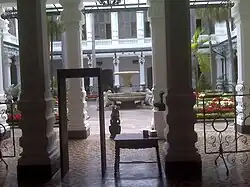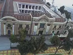 Today's building is the result of the work undertaken by the Venezuelan architect Alejandro Chataing in 1906. It is located on the corner of Gradillas a Monjas opposite the Plaza Bolívar, and occupies half of the plaza's southern section.[7] It is built in an eclectic Neoclassical style with three storeys along the main façade. The main entrance is flanked by double pillars in the composite order. It is crowned by a balcony decorated with composite pilasters and a triangular frontispiece. The east façade is also decorated with composite pillars designed to resemble those of the Roman Forum or similar works from antiquity.[8] The large colonial building has an elegant patio in the interior and also houses the museum.[4]