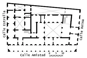 The first house was designed by José Manuel Carrerá, an architect of Dominican origin and is linked to all his companies and the projects of the Alfonso family, which was his wife's, especially the railway network that both deployed in the province of Matanzas. The influence of Don Domingo Aldama is revealed in the fact that in order to authorize him to construct the Palace, the Spanish authorities repealed an order prohibiting civil constructions in the military zone; that is, adjacent to the Campo de Marte, although the Palace's front elevation was required to face that space. Las Cuevas Toraya notes that it is a masonry house, even the interior partitions, and draws attention to the main staircase, built with Carrara marble blocks, the treads are adjusted to each other without any added external support.[4] The building has a dining room that was designed for more than one hundred people. The arcade has a height of two floors, covering the ground floor and the mezzanine. An upper deck is supported by the capital decorations, typical of neoclassical constructions, although it has some elements of the late Baroque[c] and the Renaissance.