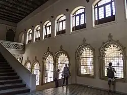 The palace is accessed by climbing the noble staircase, a monumental structure composed of two large sections with geometric yeseria gables illuminated by half-angled windows with small decorations of leaves and stems with Gothic and Mudéjar influences, topped in a crochet-like pattern on the key of the arches.
