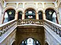 The upper floor has a large balcony with a balustrade and three further semicircular arches framed by Corinthian columns, also fluted. These columns frame the windows of the noble room.[5] Above them there are three oeils-de-boeuf and a triangular pediment on which the coat of arms of the province of Pontevedra is displayed. The windows in the corners of the building are topped by semicircular Pediments. They are decorated with Lintels with Scallops.