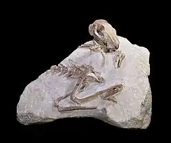 The fossil remains of rabbits are scanty and those specimens that have been found are often too fragmentary to determine satisfactory the relationship with living forms. Most recent phylogenetic analysis have recovered it as a close relative of the last common ancestor of living Leporidae and Ochotonidae, as it displays a mosaic of characters typical of both groups.[4] The bones of rabbits and hares are lightweight and fragile in structure, and so they are not easily preserved as fossils. Most of the species are inhabitants of uplands where conditions are not ideal for preservation. In a few deposits, rabbit remains seem numerous but many fossil species are known only from a few teeth and bones.