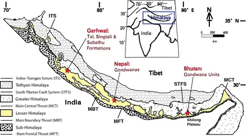 - ^ a b c Long, S.; McQuarrie, N.; Tobgay, T.; Rose, C.; Gehrels, G.; Grujic, D. (2011). "Tectonostratigraphy of the Lesser Himalaya of Bhutan: Implications for the along-strike stratigraphic continuity of the northern Indian margin". Geological Society of America Bulletin. 123 (7–8): 1406–1426. Bibcode:2011GSAB..123.1406L. doi:10.1130/b30202.1.