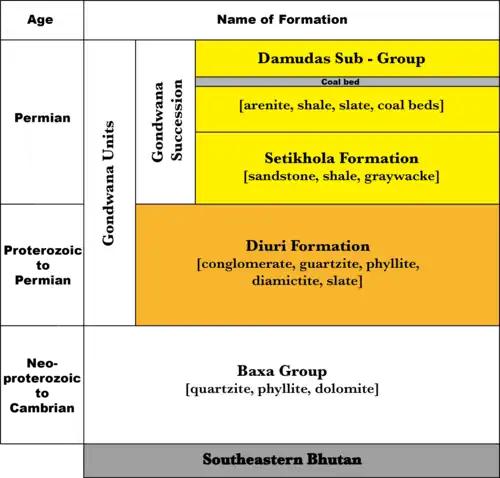 Compared with Nepal, the Gondwana strata are exposed in a relatively smaller area in Bhutan. In southeastern Bhutan, the basal LHS begins with the metamorphic Daling-Shumar Group, followed by the Baxa Group that is characterized by quartzite, phyllite and dolomite succession of Neoproterozoic to probably Cambrian age.[17][18] The bottom of the Gondwana Units (Diuri Formation) is then directly overlying the Baxa Group.