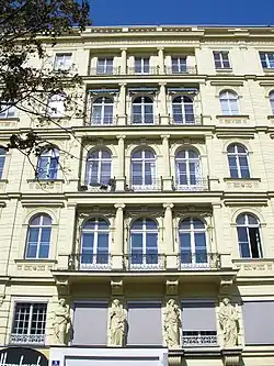 The palace is built in Historic architecture . It has six floors. There are several shops on the ground floor. Four statues are set up under the balcony on the second floor, symbolizing the four muses (dance, poetry, painting, music).