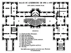 Beginning in 1835, the architect Alphonse de Gisors added a new garden wing parallel to the old corps de logis, replicating the look of the original 17th-century façade so precisely that it is difficult to distinguish at first glance the old from the new. The new senate chamber was located in what would have been the courtyard area in between.[9]