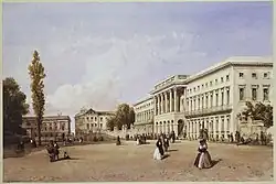 During Leopold II's reign, the palace nearly doubled in surface area. The houses located between the different buildings were destroyed[12] and gave way to two symmetrical curved galleries, which considerably widened the length of the building. A large part of the shallow grounds located in front of the palace were also filled in, in order to increase the space in front of its façade. After the designs of the king's architect Alphonse Balat, imposing rooms like the Grand Staircase, the Throne Room and the Grand Gallery were added. Balat also planned a new façade but died before the plans could be executed.