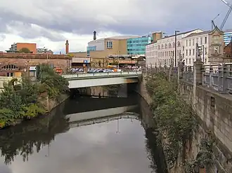 The land required on Chapel Street for the Salford approach to the proposed bridge was donated by Samuel Brooks, who as part of the deal insisted that a 150 feet (46 m) abutment was built on the Salford bank of the river, to improve the rateable value of nearby properties.[1]