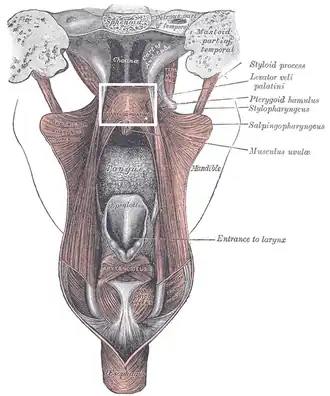 The palatine velum is slightly raised by the levator veli palatini and made tense by the tensor veli palatini; the palatopharyngeus muscles, by their contraction, pull the pharynx upward over the bolus of food and nearly come together, the uvula filling up the slight interval between them.