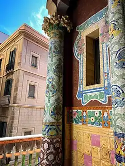 Originally, guests entered the palace from the street through two arches supported by thick pillars that opened into the vestibule. The former ticket windows, which are located in the center pillar, are beautiful concentric arches adorned with floral mosaics of various materials created by Lluís Bru.