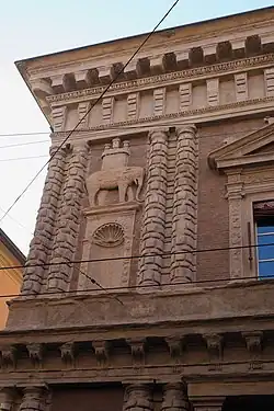 While attributed by some to Sebastiano Serlio or Baldassare Peruzzi, the palace was designed in 1517 by Andrea da Formigine.[1] The facade with the ashlar columns was commissioned in 1521 by Francesco Fantuzzi; the carved elephants with towers above the corner niches refer to the senatorial family coat of arms. The coat of arms was a pun on the ele-fantuzzi family.[2]