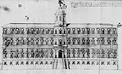 An initial design was made by Francesco Paciotto, from Urbino, and in 1558, the architect Giacomo Barozzi da Vignola, better known as Vignola, was brought in to revise the designs. Vignola had already been commissioned to design the Villa Farnese at Caprarola (Latium) for Cardinal Alessandro Farnese, the older brother of the duke. Vignola had to take Piacotto's design into account but significantly revised the design which was presented to the patrons in 1561. The drawings are for a vast palace on a scale paralleled only by the Vatican Palace in Italy; the rectangular plan is 113.25 metres by 88 metres and over 40 meters in height.[1] The building works were entrusted to Giovanni Bernardo Della Valle, Giovanni Lavezzari and Bernardo Panizzari (Caramosino). The actual construction, however, made up only less than a half of Vignola's original project and lacked many of the planned architectural features.