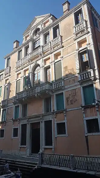 The facade, facing the Rio Marin, is of four levels with a mezzanine and two noble floors. The first noble floor is decorated with an elegant serliana with white-stone inserts and a balustrade. Both noble floors are underlined by stringcourse cornices, standing out of the pink plaster wall. There is a gable in the central part of the top floor, terminating with a tympanum. Two small chimneys replace those that originally were two high pinnacles. The interior has valuable paintings and decorative works. The palazzo has a garden, which was mentioned in the works of poet Gabriele D'Annunzio and writer Henry James—the palazzo, in fact, seems to be the one in which the stories of Il fuoco (1900) and The Aspern Papers (1888) are respectively set.[6]