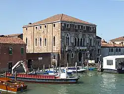 The Palazzo da Mula is a Venetian villa on the island of Murano in the Venice Lagoon, on the sub-island of San Pietro Martire, on the south bank of the Canale degli Angeli, near the Ponte Vivarini bridge that leads to the main island of Murano, San Donato. The palazzo is the last remnant of Venetian villas built in Murano in the 15th and 16th centuries. Originally there were only a few villas with extensive gardens on the island, but today the Palazzo da Mula is integrated into a row of houses.[1] The 16th and 17th-century structure and details of the palazzo can be traced back to the Da Mula family, who had acquired the palazzo from the aristocratic Diedo family in 1621. The Da Mulas resided in this palazzo until 1712, when it was rented to the aristocratic family of Giacomo Fontanella, a member of the new aristocracy of glass masters, for a sum of 110 ducats. The property then passed to Giacomo's son, Zuanne Fontanella.