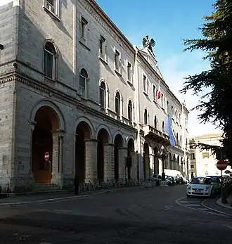 The Palazzo della Provincia e della Prefettura of Perugia has been built, by the municipal administration, to fill the empty space due to the demolition of the Rocca Paolina; it has therefore its bases above the ruin of the Rocca. Originally the purpose of this public building was not defined, it was thought for the Academy of Fine Arts;[1] for this reason It had an anonymous name: “Palazzo Nuovo” (New Palace) or “la Fabbrica di Mezzo” (the factory in the centre) because it was built in the central area occupied by the Rocca's ruins, where others private buildings were built immediately afterwards.