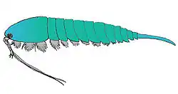 An elongate arthropod of uncertain affinities, only known from a single specimen with 44 body segments with limbs. | ![]() |
