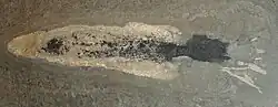- A pabulite (fossilized meal which never entered the digestive tract) was recovered from Holzmaden, being composed of an associated Passaloteuthis laevigata with its arms embracing an exuvia of a crustacean.[12] The belemnnite itself can be seen as the remnant of a failed predation attempt from a Hybodus, corroborating a possible tropic chain.[12]