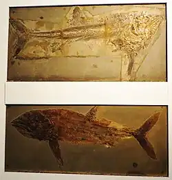 - Another specimen of Pachycormus macropterus preserves an ammonite inside its gut, likely swallowed by accident and directly responsible for the fish's death.[19]