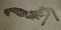 - Several empty ammonite shells from Holzmaden have been found with associated decapods inside.[6] This includes a possible member of the genus Paleastacus inside a chamber of a Harpoceras.[6] This decapod is related to the family Erymidae, which are considered to be possible bottom-dweller carnivores or carrion feeders.[6] The associated fossil has several spherical structures that had been interpreted as decapod coprolites, implying that the animal lived for a long period within the shell.[6] More recent studies had recovered new data about the inquilinism of decapods inside ammonites, this time, however, recovering three eryonoids together within a body chamber.[7] The eryonoids most likely used the ammonoid as some kind of shelter, possibly due to the shell being an ideal location to molt, protection against predators, a source of food or that the shell was used as a long-term shelter.[7] One key aspect found was that the muddy bottom was not suitable for burrowing, implying that the decapods inhabited a different shelter due to being unable to make their own.[7] Other biota are found related to the decayed ammonite shells, such as serpulid annelids and bivalves, creating what was denominated as "benthic islands".[6]