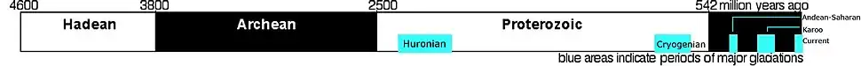 The Precambrian took place between the time when Earth first formed 4.6 billion years (Ga) ago, and 542 million years ago. The Precambrian can be split into two eons, the Archean and the Proterozoic, which can be further subdivided into eras.[27] The reconstruction of the Precambrian climate is difficult for various reasons including the low number of reliable indicators and a, generally, not well-preserved or extensive fossil record (especially when compared to the Phanerozoic eon). [28][29] Despite these issues, there is evidence for a number of major climate events throughout the history of the Precambrian: The Great Oxygenation Event, which started around 2.3 Ga ago (the beginning of the Proterozoic) is indicated by biomarkers which demonstrate the appearance of photosynthetic organisms. Due to the high levels of oxygen in the atmosphere from the GOE, CH4 levels fell rapidly cooling the atmosphere causing the Huronian glaciation. For about 1 Ga after the glaciation (2–0.8 Ga ago), the Earth likely experienced warmer temperatures indicated by microfossils of photosynthetic eukaryotes, and oxygen levels between 5 and 18% of the Earth's current oxygen level. At the end of the Proterozoic, there is evidence of global glaciation events of varying severity causing a 'Snowball Earth'.[30] Snowball Earth is supported by different indicators such as, glacial deposits, significant continental erosion called the Great Unconformity, and sedimentary rocks called cap carbonates that form after a deglaciation episode. [31]