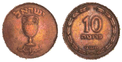 10 pruta | 27 mm | 6.1g | Two-handled amphora; "Israel" in Hebrew and Arabic.