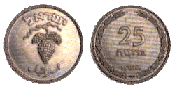 25 mil | 30 mm | 3.8 g | Aluminum | Cluster of grapes, based on coins struck during the Bar-Kochba Revolt (132-135 CE); "Israel" in Hebrew above and in Arabic below. | The denomination "25 Mil" in Hebrew and Arabic; date in Hebrew below; two stylized olive branches around, based on coins struck during the Bar-Kochba Revolt (132-135 CE). | 6 April 1949 | 5708 (1948),