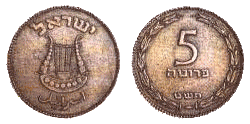 5 pruta | 20 mm | 3.2 g | Bronze | Four-stringed lyre; "Israel" in Hebrew and Arabic.