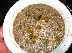 Bread dips and side dishes such as hummus, baba ghanoush, mutabbel and labeneh are frequently served during breakfast and dinner. Hummus, the Arabic word for garbanzo beans, is commonly made as hummus bi tahini. Palestinians soak the garbanzo beans with water overnight, then boil them in a pot for at least an hour. The resulting ground beans are mixed with tahini (sesame paste) and sometimes lemon juice.[21] It is often lathered in olive oil and sometimes sprinkled with paprika, oregano and pine nuts—the latter is especially used in the West Bank.[22] The town of Abu Ghosh, west of Jerusalem, is a popular hummus destination for Israelis and tourists.[23] Hummus could also be mixed, boiled or cooked with ful (fava beans) and results in a completely different dish called mukhluta that has a distinct flavor and brownish color.[8]