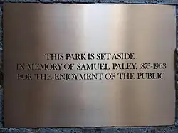 A privately owned public space,[3][5] Paley Park was financed by the William S. Paley Foundation and was named by Paley for his father, Samuel Paley. A plaque near the entrance reads: "This park is set aside in memory of Samuel Paley, 1875–1963, for the enjoyment of the public." The Paley Center for Media was originally located next to Paley Park in the 17 storey office building at One East 53rd Street.[6]