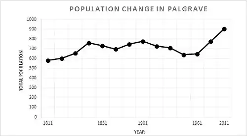 As the neighbouring graph identifies, the total population of Palgrave from 1811 has fluctuated slightly, but has shown a gradual increase in population from 580 (1811) to 905 (2011).[8] It is clear that a slight dip in the 1961 period saw a rapid increase in the population till 2011 where it reached its peak of 905 people.