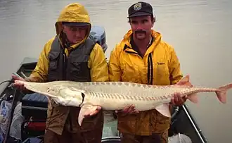 In 1990, the U.S. Fish and Wildlife Service placed the pallid sturgeon on its endangered species list because few young individuals had been observed in the preceding decade and sightings had greatly diminished;[6] the species is now rarely seen in the wild. It was the first fish species in the Missouri River drainage area to be listed as endangered, and a loss of its habitat is thought to be responsible for its decline. The vast majority of the Missouri River drainage system has been channeled and dammed, reducing the gravel deposits and slow-moving side channels that are its favored spawning areas. Until the middle of the 20th century, pallid sturgeon were common and anglers found catching such a large fish in fresh water a rewarding experience. The species is considered to be good-tasting, and its eggs have been used as caviar, although less commonly than those of many other sturgeon.[7]