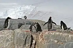 The station is named for Nathaniel B. Palmer, usually recognized as the first American to see Antarctica and one of a handful of contenders for the first person to see the continent in 1820.[2] The maximum population that Palmer Station can accommodate is 46 people. The normal austral summer contingent varies, but it is generally around 44 people. Palmer is staffed year-round; however, the population drops to around 19 people for winter maintenance after the conclusion of the summer research season.[1] There are science labs, dorms, offices, and a cafeteria in the Bio-Lab building, and the other main building is GWR (Garage, Warehouse, and Recreation). Webcam images of the station and a penguin colony on nearby Torgersen Island are available at the station's web site.[3] Palmer also supports the automated RN73 atmospheric monitoring site.[4]