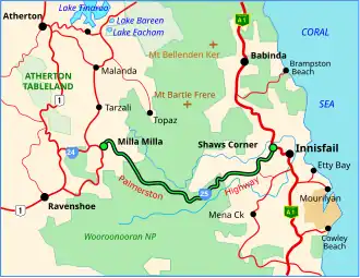 The highway splits from the Bruce Highway in Goondi just north-west of Innisfail (17°30′52″S 145°59′37″E / 17.51432°S 145.99374°E). It then winds through the Wooroonooran National Park to the township of Millaa Millaa, with no major road junctions. It terminates at an intersection with Old Palmerston Highway (now called Beatrice Way)[2] and Main Street (17°30′48″S 145°36′47″E / 17.51328°S 145.61310°E).[2] Its total length is 54.6 kilometres.[3]