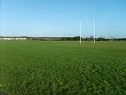 Mill Lane leads to the original Palmerstown settlement and the centre of industry, which once employed over 600 millhands, craftsmen, and labourers. This seventeenth-century low-lying waterside industrial village was complete with flax, seed, oil, flour and cloth mills.[20] The ruin of a pre-Norman church and the remains of the once prosperous thriving community are situated near the river. A small ferry crossed the Liffey here, to where the Wren's Nest pub was situated on the North side. A football ground opposite the river Liffey is home to Palmerstown F.C. Muhammad Ali visited Stewarts Hospital on 15 July 1972 when the hospital was hosting its annual sporting fete.[21]