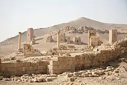 Palmyra began as a small Neolithic settlement near the Efqa spring on the southern bank of Wadi al-Qubur.[20] The much later Hellenistic settlement of Palmyra was also located near the Efqa spring on the southern bank of Wadi al-Qubur.[20] It had its residences expanding to the wadi's northern bank during the first century.[16] Although the city's walls at the time of Zenobia originally enclosed an extensive area on both banks of the wadi,[16] the walls rebuilt during Aurelian's reign surrounded only the northern-bank section.[21][16] Most of the city's monumental projects were built on the wadi's northern bank,[22] among them is the Temple of Bel, on a tell which was the site of an earlier temple (known as the Hellenistic temple).[23] However, excavation supports the theory that the tell was originally located on the southern bank, and the wadi was diverted south of the tell to incorporate the temple into Palmyra's late first and early second century urban organization on the north bank.[24]