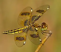 Palpopleura jucunda, commonly known as the yellow-veined widow, is a species of dragonfly in the family Libellulidae, which is native to sub-Saharan Africa.