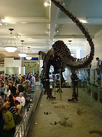 One of the most well-known discoveries made by Bird was the "chase sequence", which contains the tracks of a herd of sauropods and at least one theropod that appears to follow the herd. These well-preserved tracks were excavated and removed from the riverbed by Bird's team slab by slab; portions of the trackways were then reassembled at the Texas Science and Natural History Museum in Austin as well as at the American Museum of Natural History in New York.[6] The tracks have been attributed to dinosaurs similar to Sauroposeidon and Acrocanthosaurus, respectively. Other well-known and studied sites containing similar trackways are the Taylor Site, the Blue Hole Ballroom, and the Blue Hole Parlor.[6]