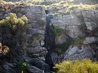 In the ravines and on the mountain slopes are copses or small woods of tabaquillo (Polylepis australis)[7] and mayten (Maytenus boaria),[8] called in the mountain zone "quebracho", the coexistence of which is a unique biogeographical phenomenon. The tabaquillo has relatives which are distributed the length of the Andes from Venezuela to Argentina, while the mayten originates from the woodlands of south-west Argentina (the cool Andean-Patagonian woodland).[9] The greatest density of these woods is in the bottoms of the ravines, where they acquire a low forest physiognomy with great quantities of ferns and epiphytes. Both the grasslands and the woodlands of the pampas and of the ravines respectively are composed of plants of very diverse origins. Some, approaching from the eastern slopes of the mountainous area, are native to the Austro-Brazilian region. Other species of specifically Andean origin have in the Pampa de Achala their most southerly distribution. On the other hand, numerous species of the south of Argentina find in this region their most northerly habitat.