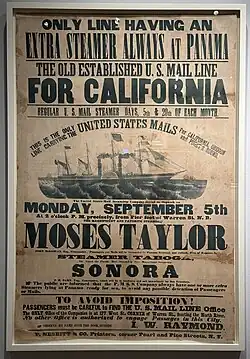 The original line was built by the United States and the principal incentive was the vast increase in passenger and freight traffic from the Eastern United States to California following the 1849 California Gold Rush. The United States Congress had provided subsidies to companies to operate mail and passenger steamships on the coasts, and supported some funds for construction of the railroad, which began in 1850; the first revenue train ran over the full length on January 28, 1855.[3] Referred to as an inter-oceanic railroad when it opened,[4] it was later also described by some as representing a "transcontinental" railroad, despite traversing only the narrow isthmus connecting the North and South American continents.[5][6][7][8] For a time the Panama Railroad also owned and operated ocean-going ships that provided mail and passenger service to a few major US East Coast and West Coast cities, respectively.