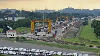 The Panama Canal Railway (PCR, Spanish: Ferrocarril de Panamá) is a railway line linking the Atlantic Ocean to the Pacific Ocean in Central America. The route stretches 47.6 miles (76.6 km) across the Isthmus of Panama from Colón (Atlantic) to Balboa (Pacific, near Panama City).[2] Because of the difficult physical conditions of the route and state of technology, the construction was renowned as an international engineering achievement, one that cost US$8 million and the lives of an estimated 5,000 to 10,000 workers. Opened in 1855, the railway preceded the Panama Canal by half a century; the railway was vital in assisting the construction of the canal in the early 1900s. With the opening of the canal, the railroad's route was changed as a result of the creation of Gatun Lake, which flooded part of the original route. Following World War II, the railroad's importance declined and much of it fell into a state of neglect until 1998, when a project to rebuild the railroad to haul intermodal traffic began; the new railroad opened in 2001.