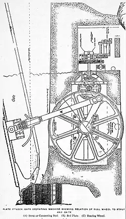 The original gate machinery consisted of a huge drive wheel, powered by an electric motor, to which was attached a connecting rod, which in turn attached to the middle of the gate.[8] The gates are hollow and buoyant, much like the hull of a ship, and are so well balanced that two 19 kW (25 hp) motors are enough to move each gate leaf. If one motor fails, the other can still operate the gate at reduced speed.[9]
