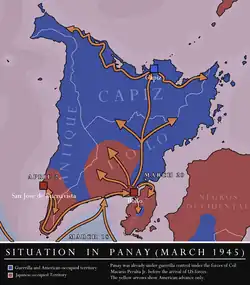 On 18 March 1945, after two weeks of aerial bombardment of Japanese positions, the 40th Infantry Division, spearheaded by the 185th Infantry Regiment, landed unopposed at Tigbauan, several miles south of Iloilo City. A 23,000-strong guerrilla force under Col. Macario Peralta had secured most of Panay. Gen. Eichelberger recalled, "Filipino guerrillas stood stiff, resplendent in starched khaki uniforms and ornaments and decked in battle gear". Lt. Charles Stewart said "An interesting incident occurred during the Panay invasion. The landing was several miles from Ioilo City and I flew up to the city on reconnaissance. After circling the city a few times I noticed a group of people had come down to the beach, waving at us. They had printed in large letters in the sand, "Japs are gone." I radioed that good news back to the USS Cleveland. I imagine the troops walking up the road toward Ioilo City still took precautions."[3] This video on YouTube of the Panay landing taken by the Army Pictorial Service shows the unopposed landing and march into Iloilo City. The regiment proceeded to seize airfields at Mandurriao, Iloilo City, and at Cabatuan, Iloilo[4] which was located in the now Iloilo International Airport at Cabatuan, Iloilo.