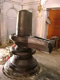 It is a brick temple with a plaster finish and no terracotta ornamentation. It follows the Pancha Ratna (five pinnacle) style of temple architecture. Each of the five pinnacles are composed of several smaller pinnacles.[6] It is built over a raised platform of 11.66 feet (3.55 m) height, and its towers have beehive type design.[1][4] Built in brick masonry, in plan it is 65 feet (20 m) square,[1] with "north Indian type turrets and plastered finish".[3] The central sanctum is the only chamber of the temple which is 13.25 feet (4.04 m) square. A Shiva Linga, carved from black basalt stone is deified in the sanctum; it is the largest in the country. The central chamber is enclosed within a passage that runs on all four sides. The passage has cusp arched entrances from four sides. The temple tower consists of five decorated spires. The internal and external plastered walls of the temple are decorated with panels with themes from Hindu mythology. The raised platform of the temple is accessed through two brick built stairways, one from the north and the other from the southern direction.[1][6]