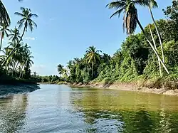 The mouth is located 52 kilometres (32 mi) south of Tanga.[7] The river is tidal for a distance of 22 miles (35 km) from the entrance.[11] The southern side of the entrance is marked by a perpendicular bluff named Bweni, about 200 feet (61 m) high; there is a village of the same name, Bweni, situated here. The northern side of the entrance is a flat sandy beach that extends from the head of the bay. There are several settlements at the entrance, two on the northern and two on the southern bank. Historically, the town of Pangani, on the river's left bank, had a reputation for fevers.[13] At its estuary, by Pangani town, the river is about 600 feet (180 m) in breadth, and 12–15 feet (3.7–4.6 m) deep.