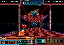 Panorama Cotton is a pseudo-3D scrolling shooter reminiscent of Space Harrier, set in an anime-style fantasy world.[3][4] Various levels scroll "into the screen", vertically, horizontally, or diagonally. The player can move Cotton over the screen, shooting at oncoming enemies and avoiding obstacles in her way. Cotton can upgrade her weapon to higher levels as the player progresses, and can also cast magical spells by collecting special items.